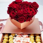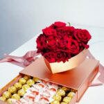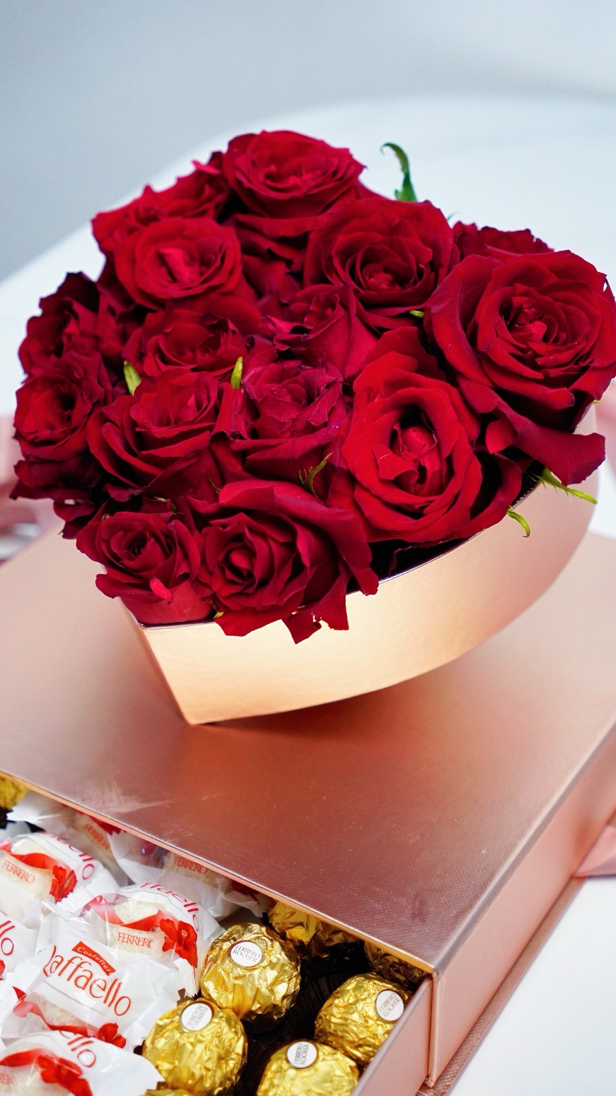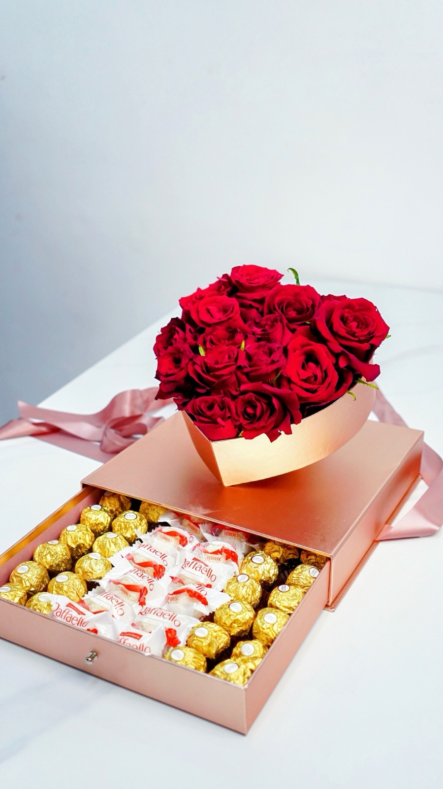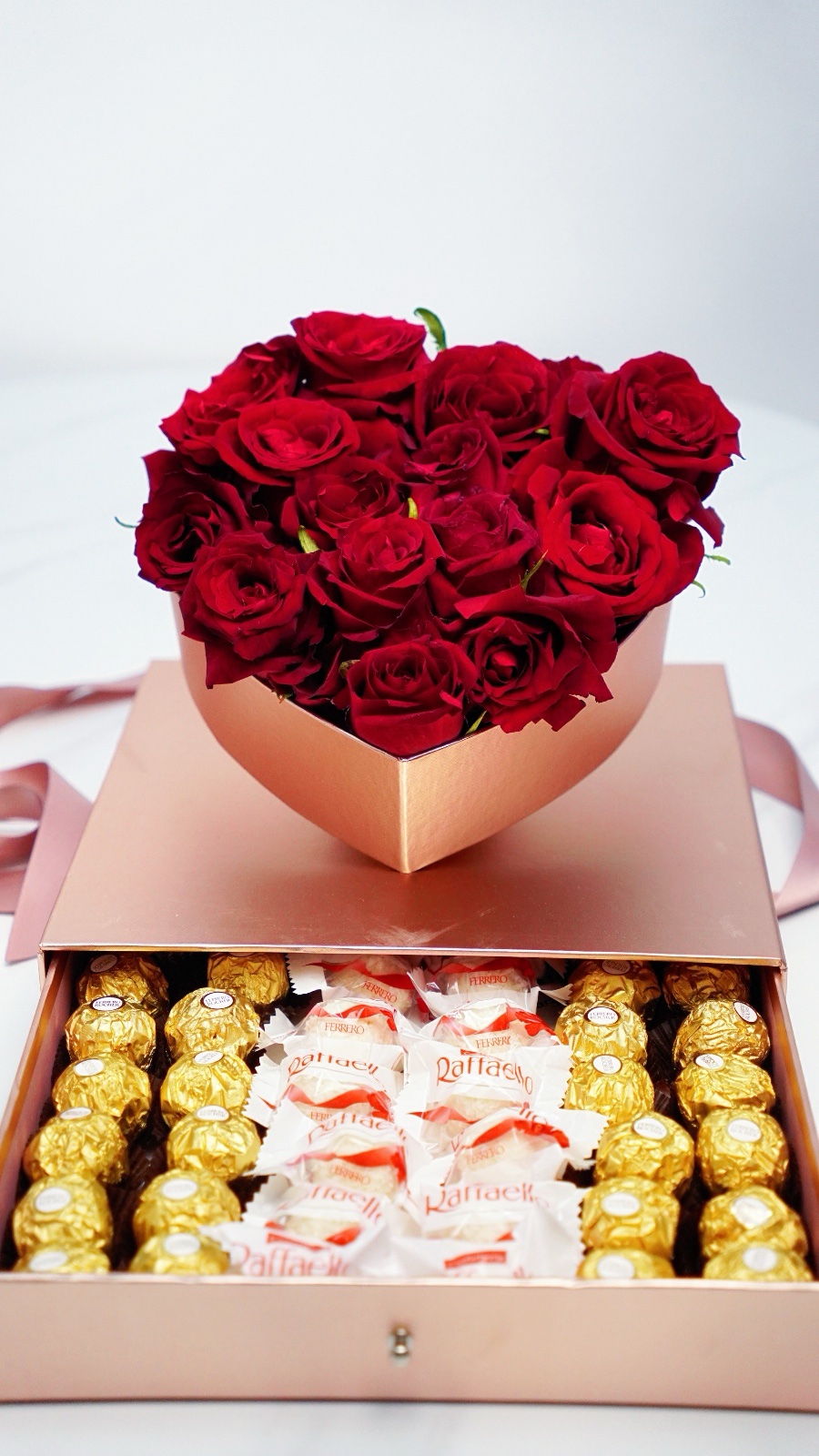 Luxueux coffret de 15 roses + mix de chocolat Ferrero et Raffaelo